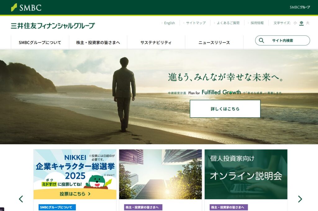 三井住友フィナンシャルグループ(SMFG)は、日本を代表する三大メガバンクのひとつであり、銀行を中心に証券、信託、カード、リースなど幅広い金融サービスを展開しています。