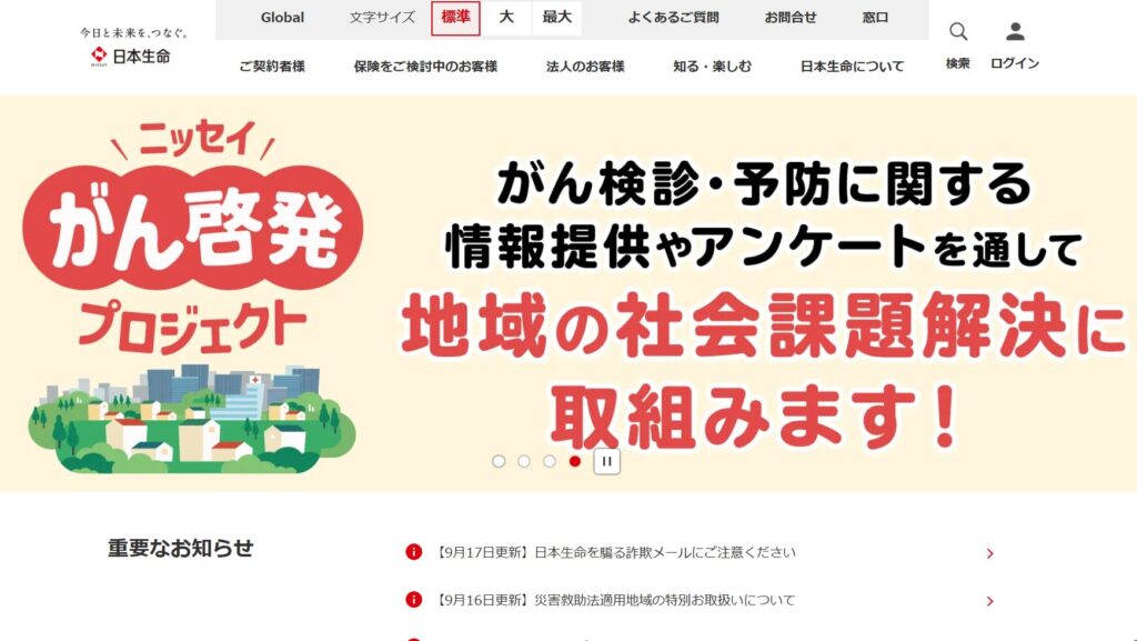 日本生命保険相互会社(ニッセイ)は、国内生命保険市場において最大級のシェアを誇る保険会社です。個人保険・団体保険を中心に幅広い保険商品を展開し、資産運用や海外事業なども積極的に展開しています。