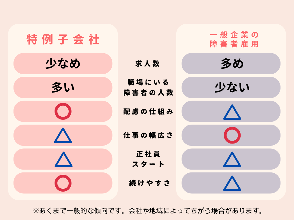 特例子会社と一般企業の障害者雇用枠には、それぞれにちがいがあります。しかし、どちらが良い・悪いと決められるものではありません。